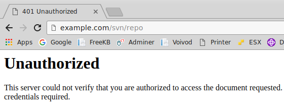 You can now go to http://example.com/svn/repo and you will be prompted to provide a username and password. Since we've not yet setup any users that have access to the respository, you will get Unauthorized. You will need to create a username and password that can be used to authenticate into the Subversion repository.