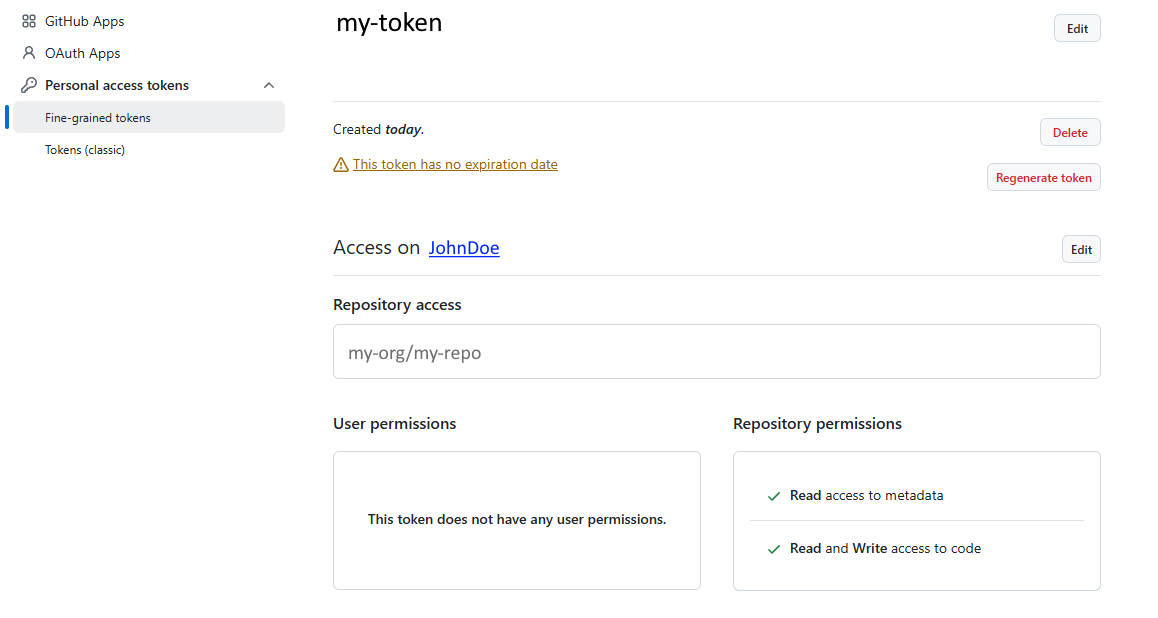 Or better yet, using a GitHub fine grained Personal Access Token (PAT) that is limited to only the repository you want to clone. Only read access is needed to clone the repository but chances are you probably are going to want to create a commit to a file in the repo and push the commit (e.g. git push origin HEAD) and write access is needed to push the commit.