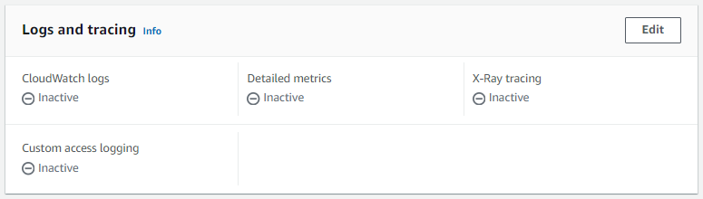 But this will not log actual GET/POST requests to your API Gateway. In your API Gateway Stage, by default, CloudWatch logs are Inactive. Click on Edit and update this to Active.
