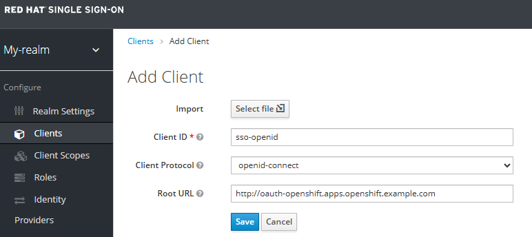Let's configure OpenShift to use SSO for authentication. In the SSO console, select Manage Realms > add realm.