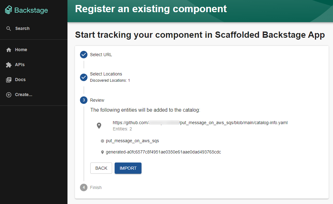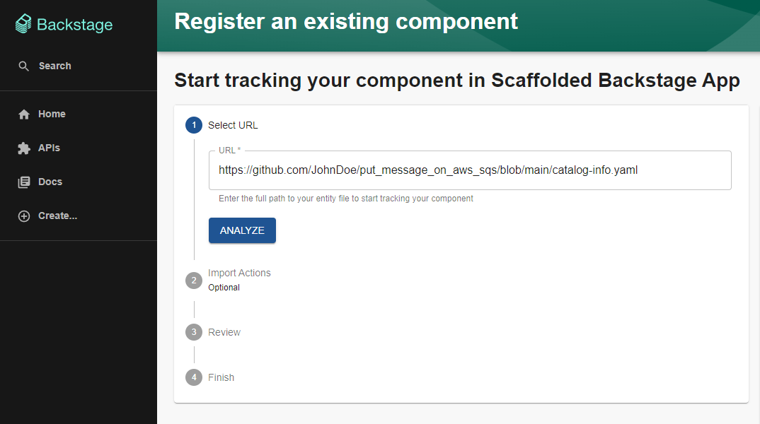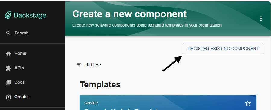 In the Backstage console, let's select Create > Register Existing Component.