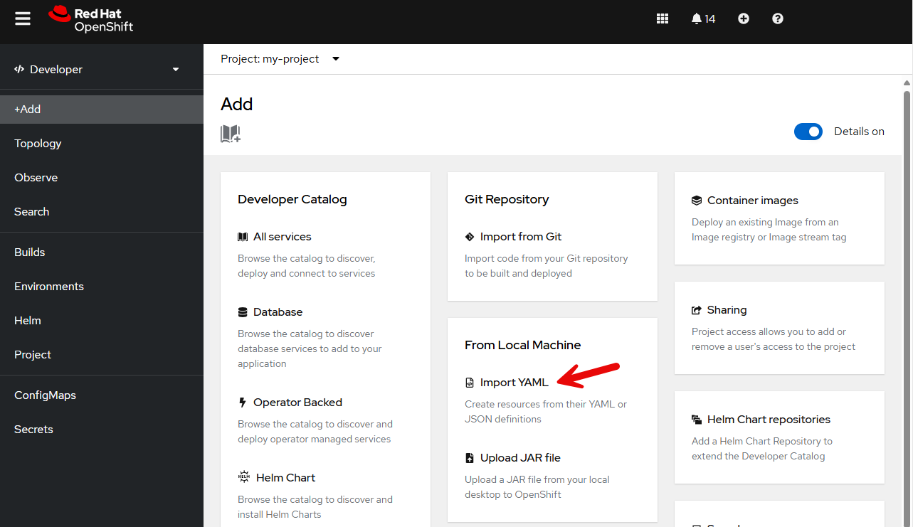 Or in the OpenShift console, in the Developer view, select the project you want to restore, and then select +Add > Import YAML.