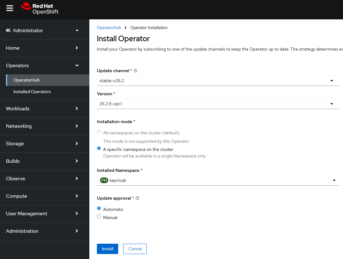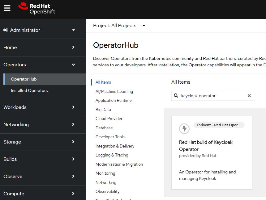 In the OpenShift console, at Operators > Operator Hub search for the Red Hat build of Keycloak Operator.