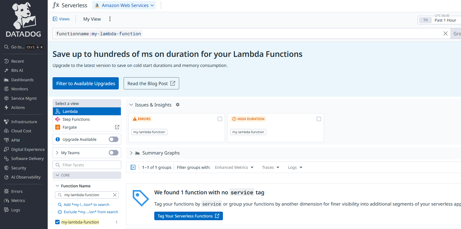 In the left panel of the DataDog console, select Infrastructure > Serverless > Lambda, and use the filter to locate your Lambda Function. Here is a screen shot showing my-lambda-function.