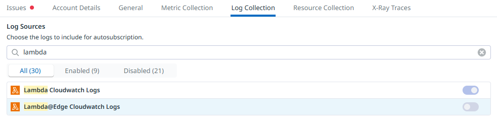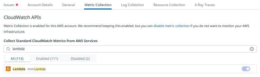 If you want DataDog to be able to display your Lambda's metrics, on the Metric Collection tab, ensure Lambda is enabled.